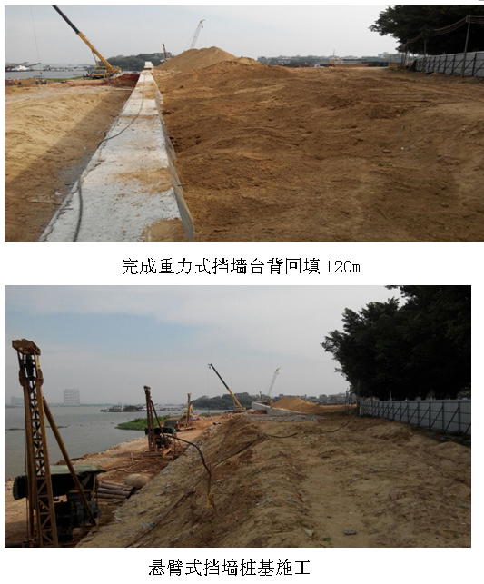 1、擋土墻工程:完成懸臂式擋墻樁基28根,重力式擋墻200m;